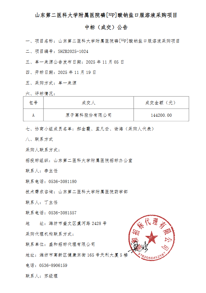 【山东第二医科大学附属医院】山东第二医科大学附属医院磷〔32P〕酸钠盐口服溶液采购项目中标(成交)公告