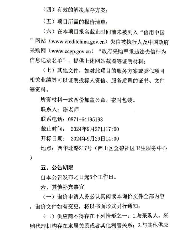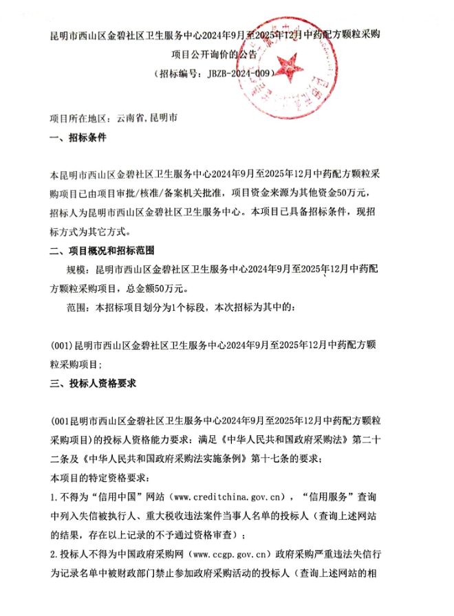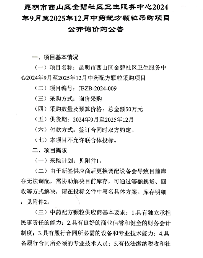 【昆明市西山区金碧社区卫生服务中心】云南省昆明市西山区金碧社区卫生服务中心2024年9月至2025年12月中药配方颗粒采购项目公开询价的公告