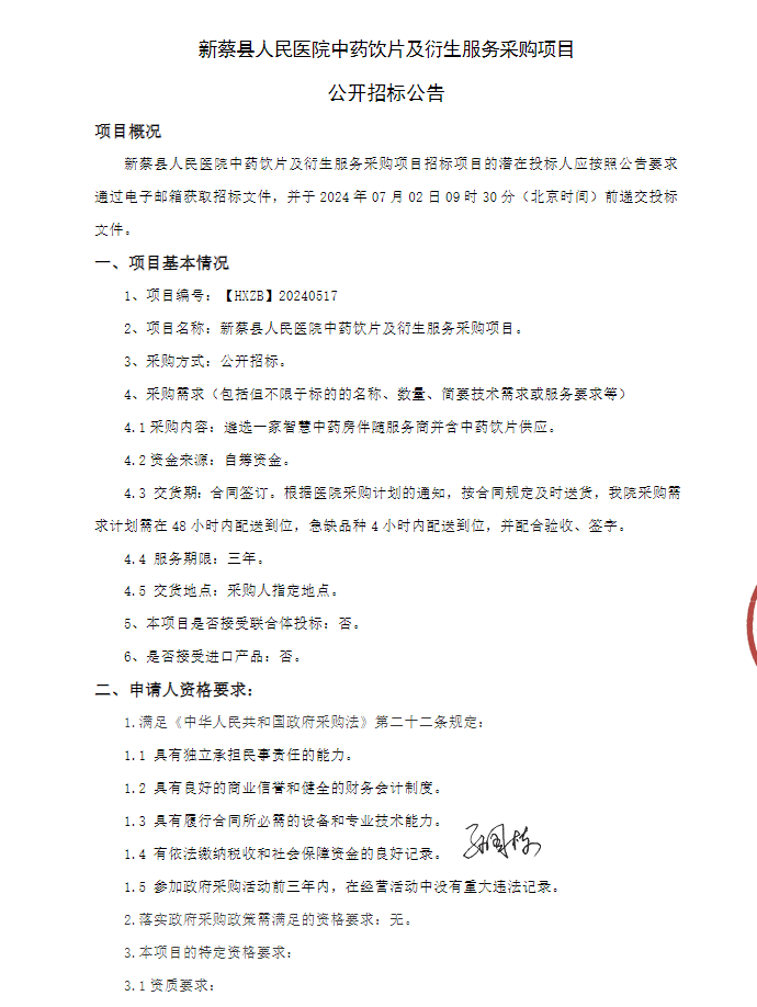 【驻马店市新蔡县人民医院】河南省驻马店市新蔡县人民医院中药饮片及衍生服务采购项目公开招标公告
