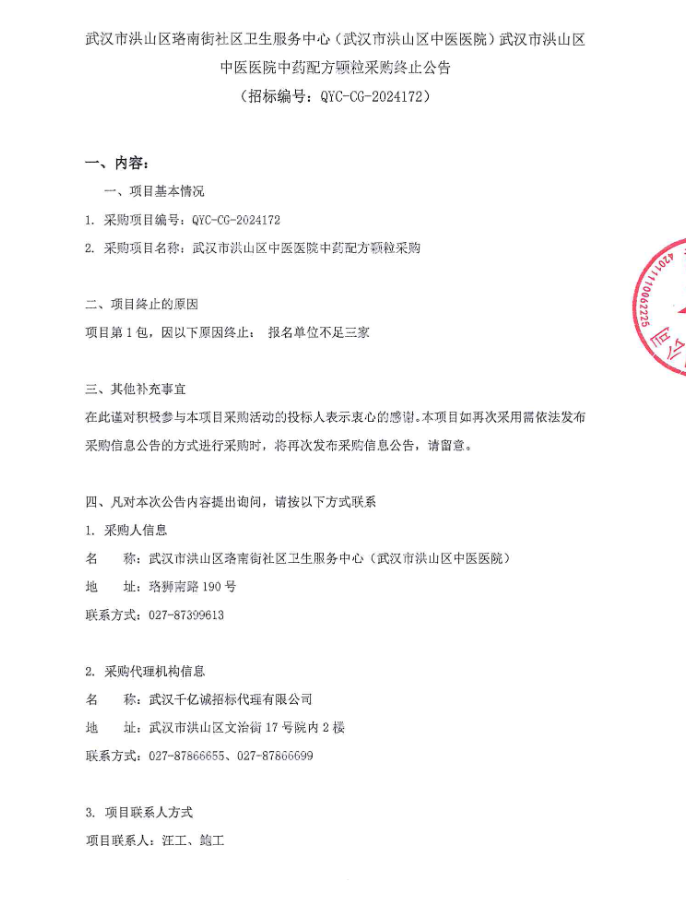 【武汉市洪山区珞南街社区卫生服务中心】湖北省武汉市洪山区珞南街社区卫生服务中心(武汉市洪山区中医医院)武汉市洪山区中医医院中药配方颗粒采购终止公告
