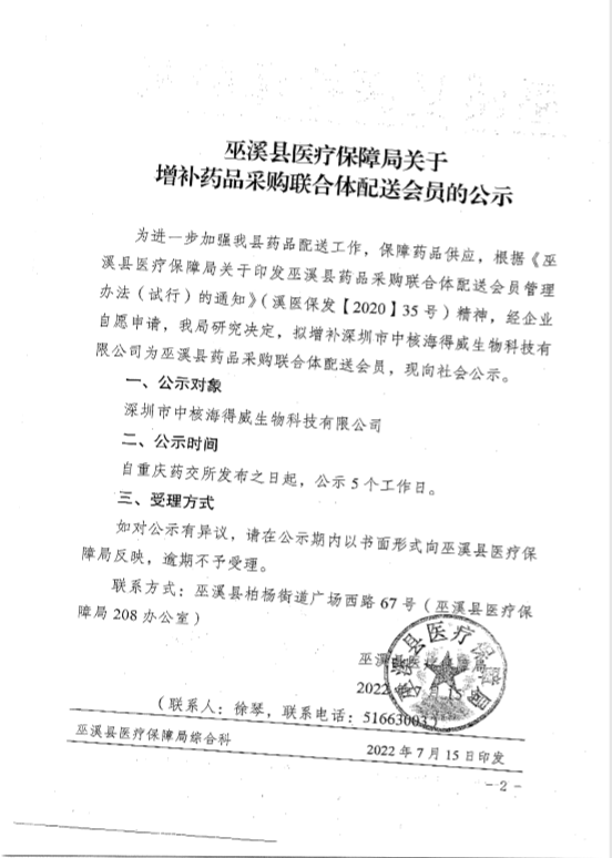 【重庆】重庆市巫溪县医疗保障局关于增补药品采购联合体配送会员的公示(20220719)