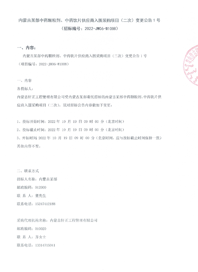 【内蒙古某部】中药颗粒剂、中药饮片供应商入围采购项目(二次)变更公告1号