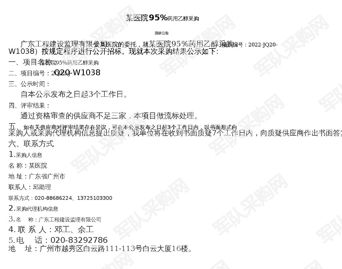 广东工程建设监理有限强其医院的委托,就某医院95%药用乙醇采购编号∶2022-JQ20-JQ20-W1038)按规定程序进行公开招标。