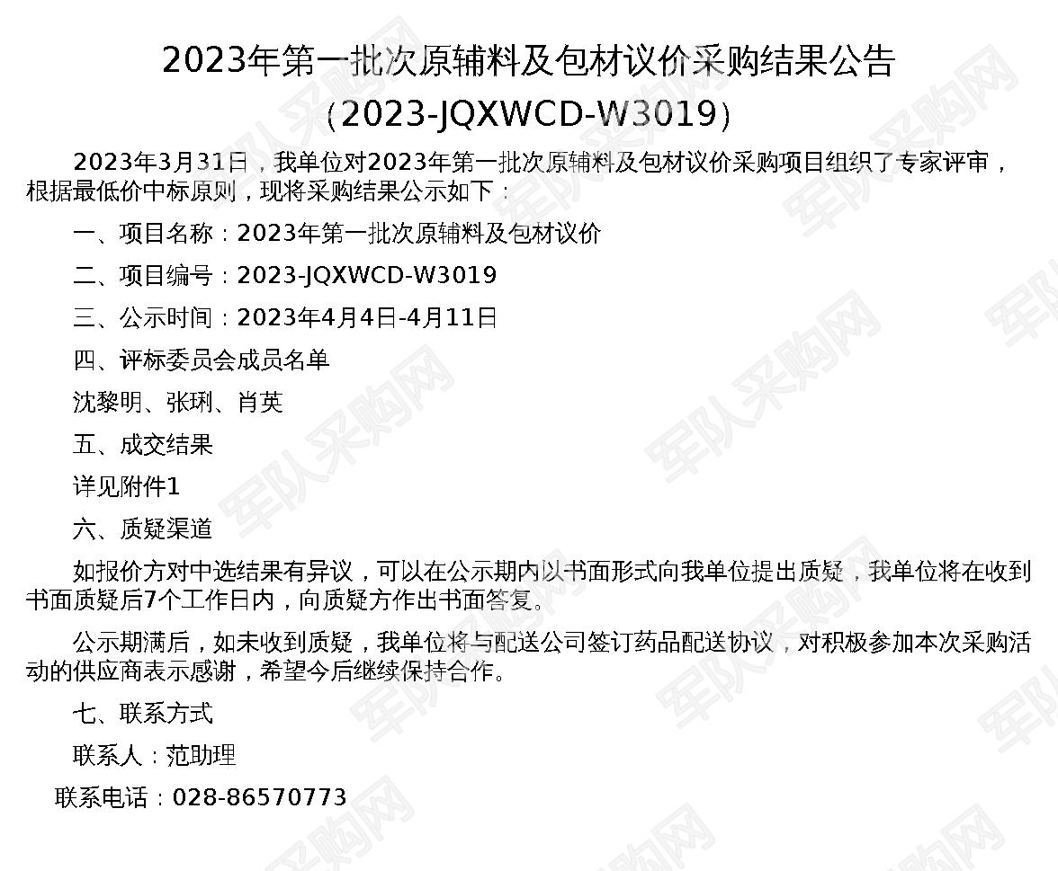【军队采购】军队采购网2023年第一批次原辅料及包材议价采购结果公告(2023-JQXWCD-W3019)