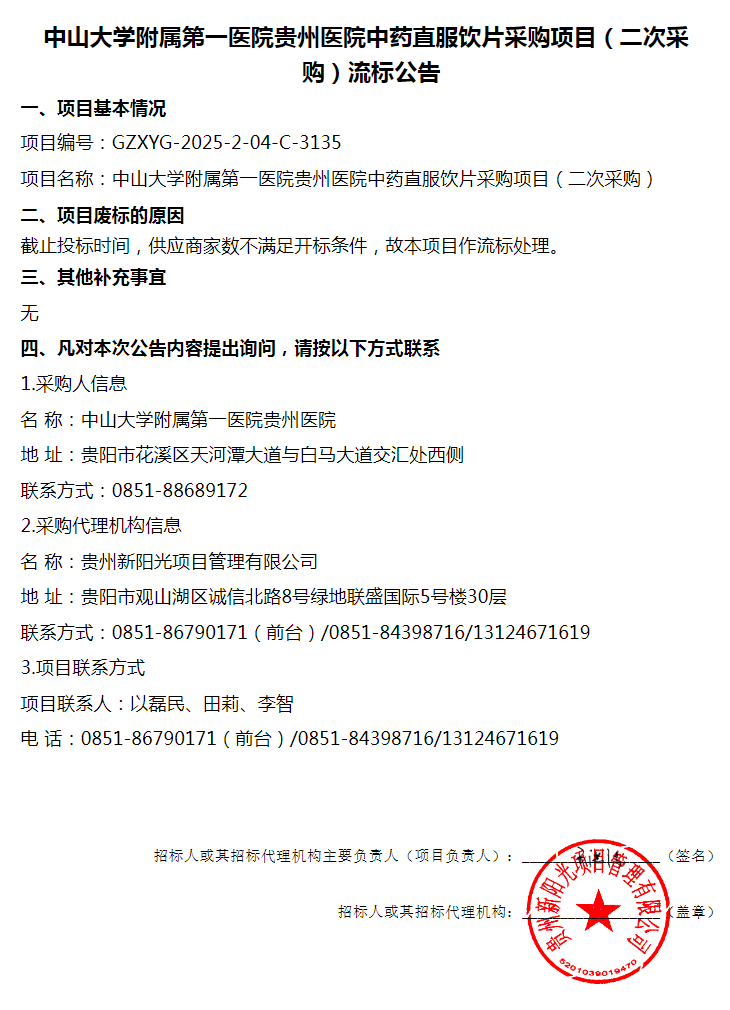 【中山大学附属第一医院贵州医院】中山大学附属第一医院贵州医院中药直服饮片采购项目(二次采购) 流标公告
