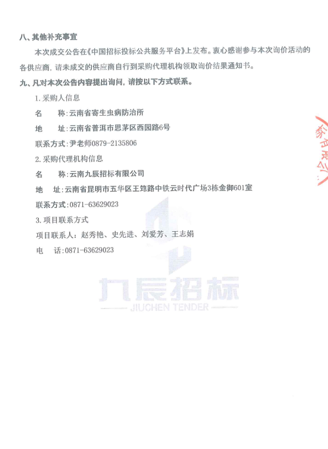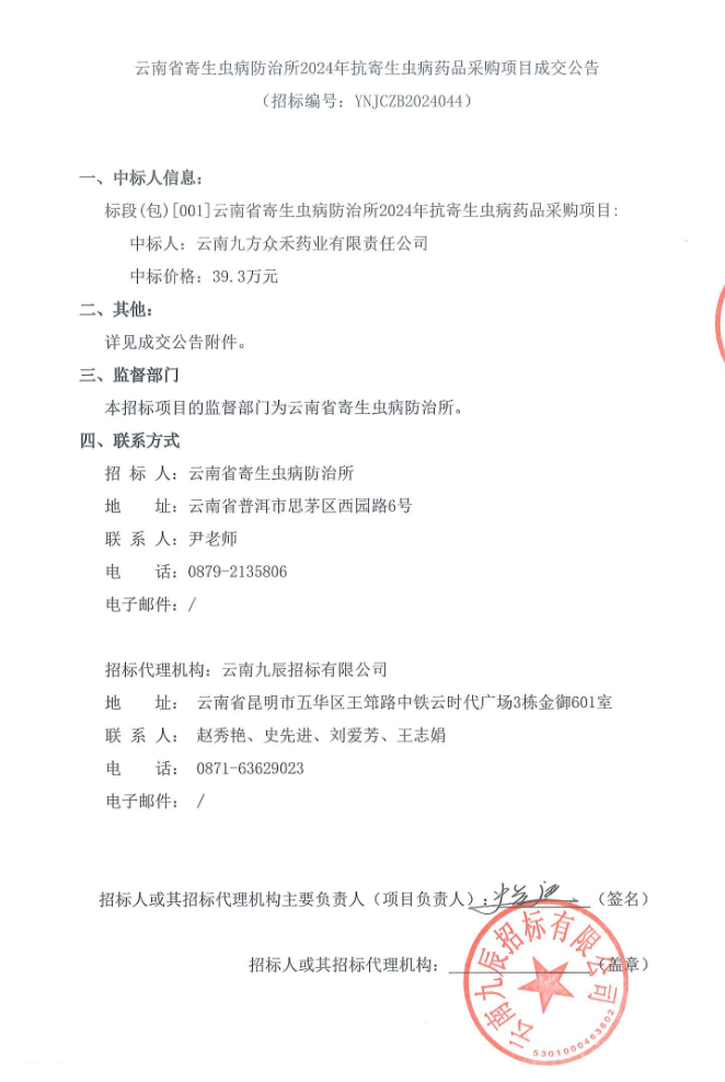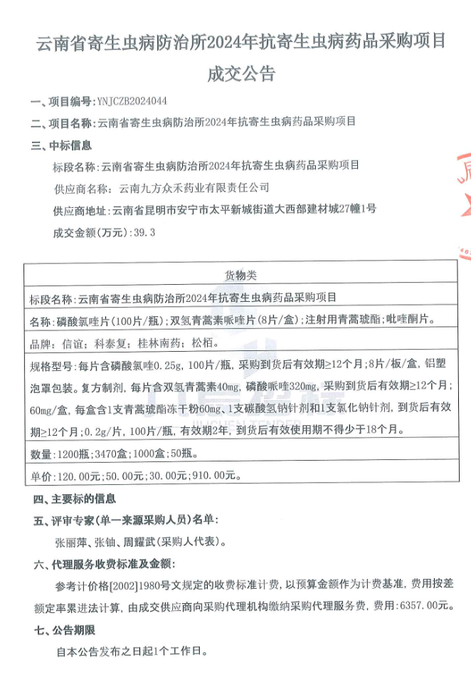 【云南省寄生虫病防治所】云南省寄生虫病防治所2024年抗寄生虫病药品采购项目成交公告