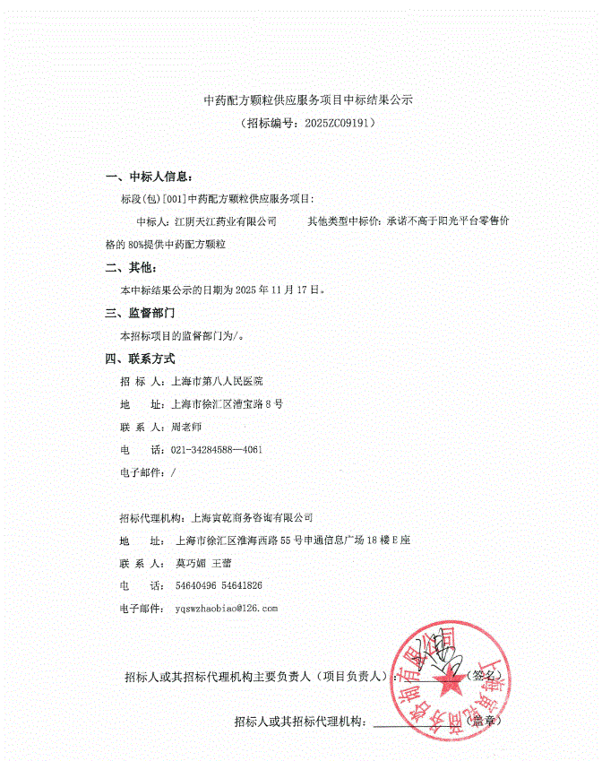 【上海市第八人民医院】上海市第八人民医院中药配方颗粒供应服务项目中标结果公示