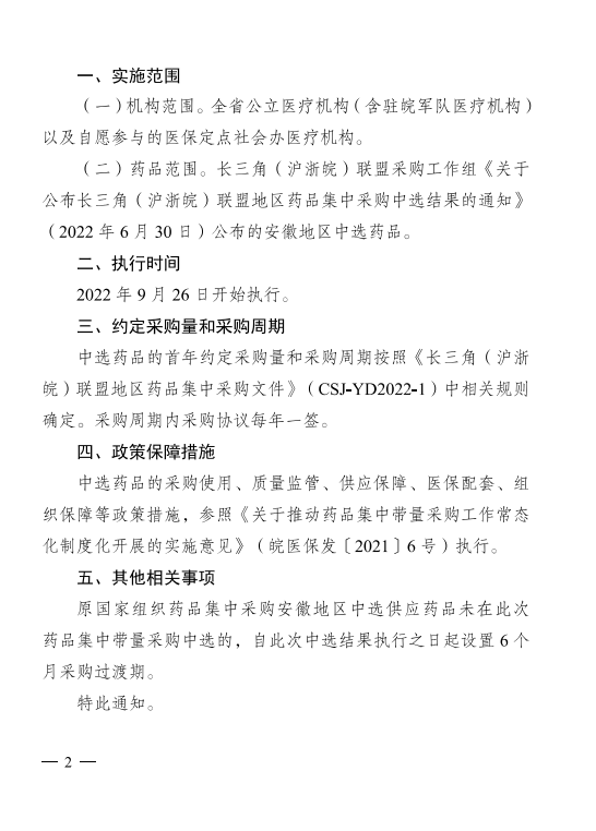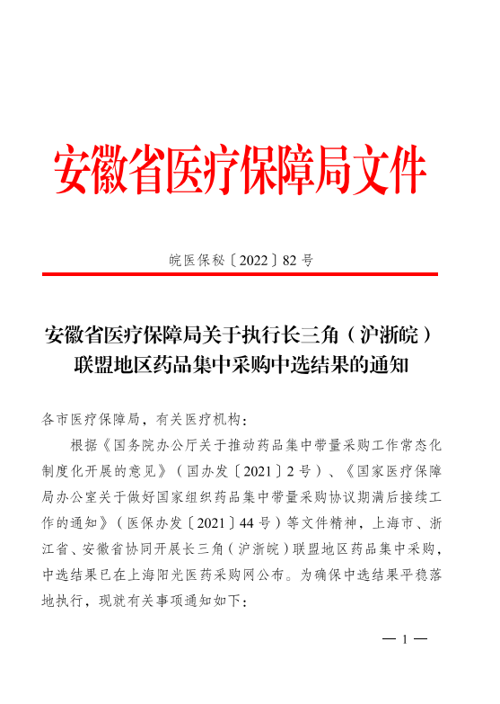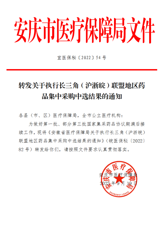 【安庆】安徽省安庆市转发关于执行长三角(沪浙皖)联盟地区药品集中采购中选结果的通知