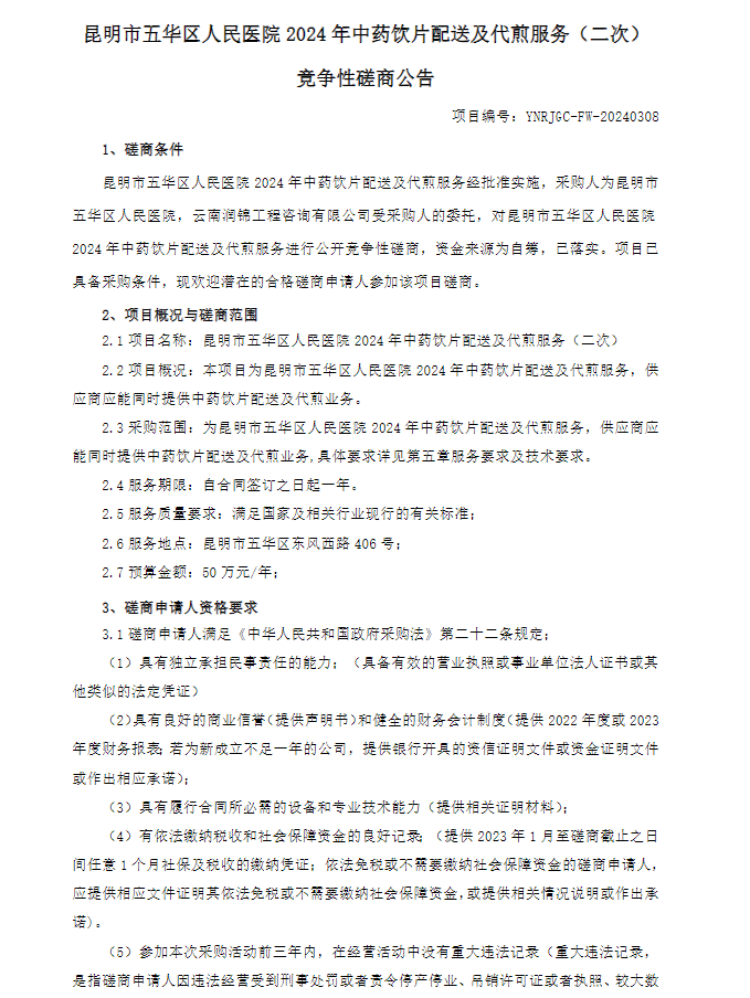 【昆明市五华区人民医院】云南省昆明市五华区人民医院2024年中药饮片配送及代煎服务 (二次)竞争性磋商公告