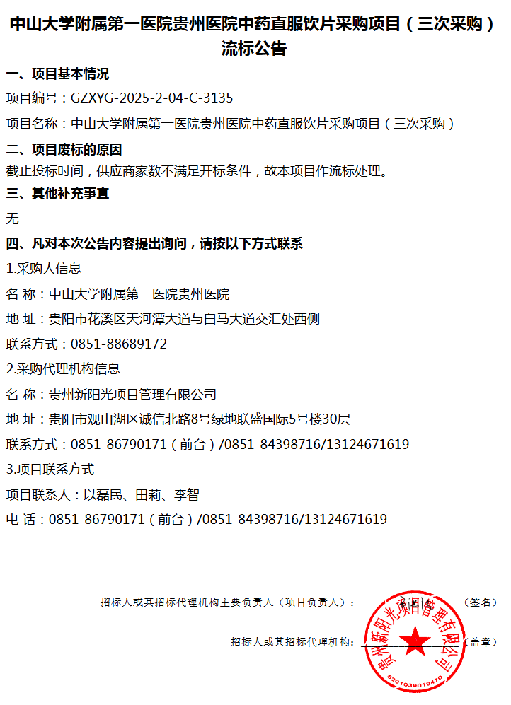 【中山大学附属第一医院贵州医院】中山大学附属第一医院贵州医院中药直服饮片采购项目(三次采购) 流标公告