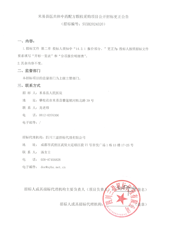 【攀枝花市米易县人民医院】四川省攀枝花市米易县医共体中药配方颗粒采购项目公开招标更正公告