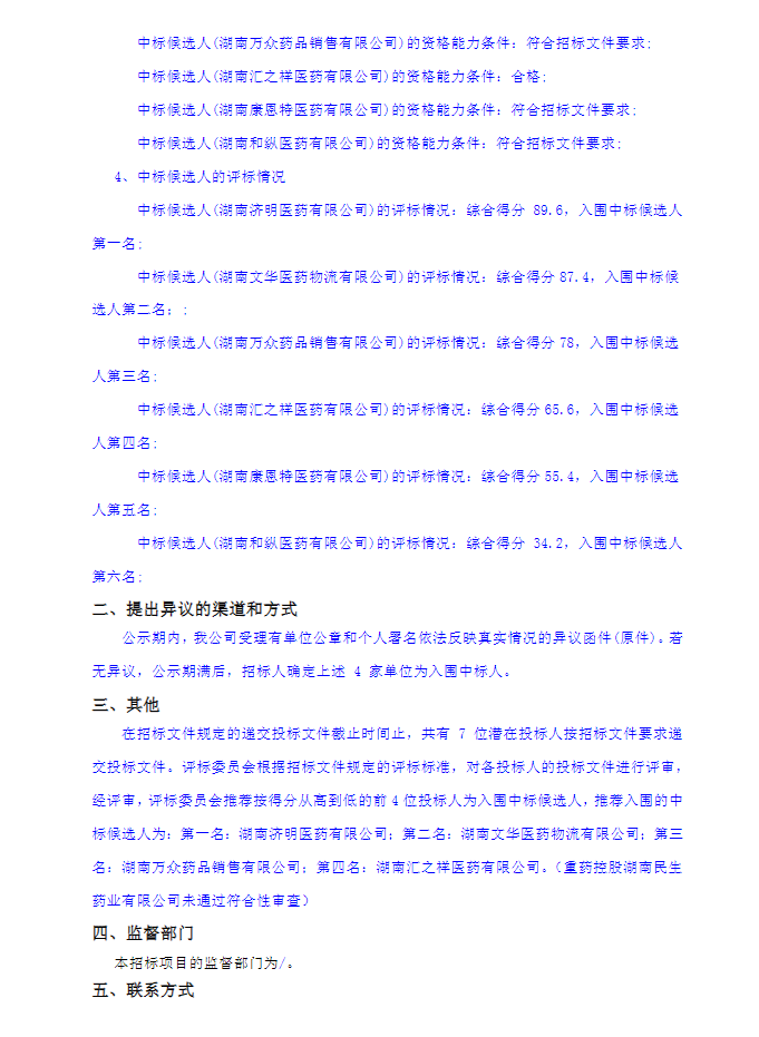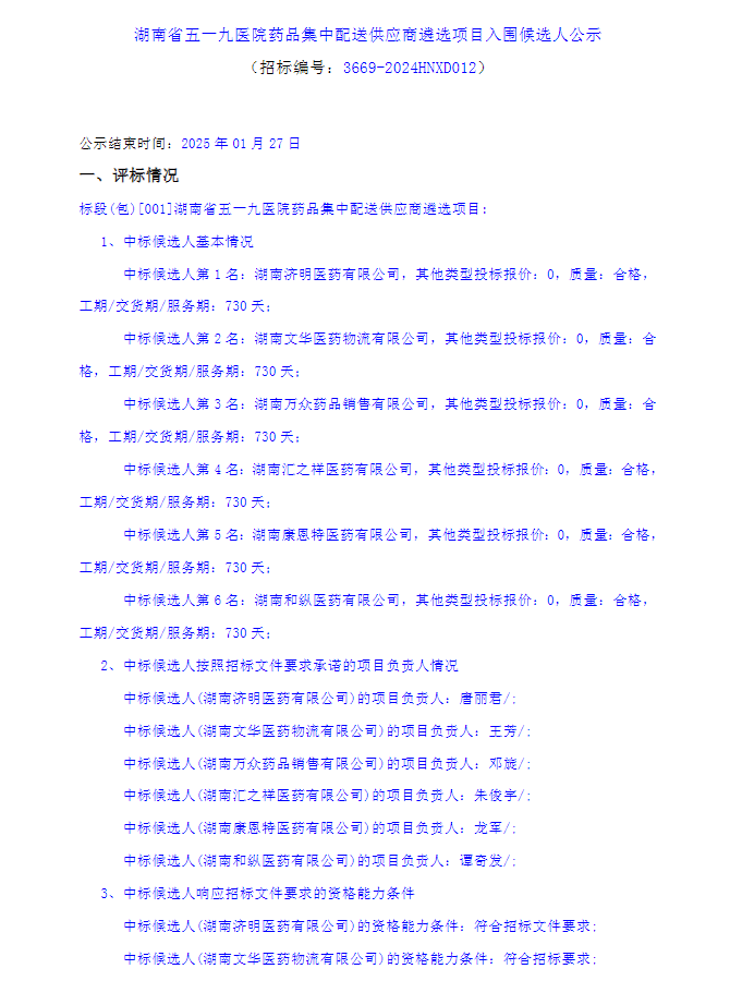 【湖南省五一九医院】湖南省五一九医院药品集中配送供应商遴选项目入围候选人公示