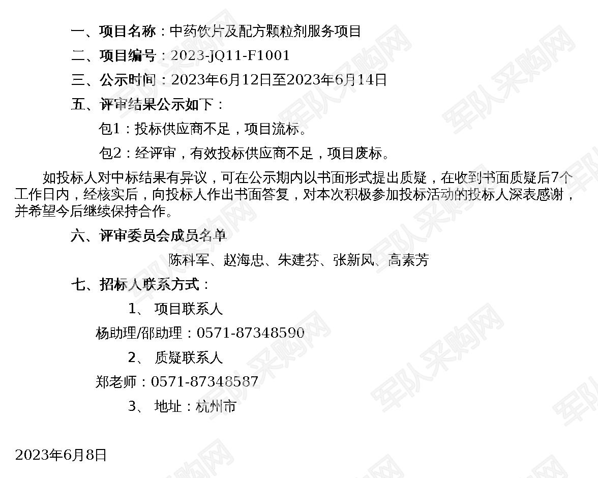【军队采购】军队采购网中药饮片及配方颗粒剂服务项目流标公示(2023-JQ11-F1001)