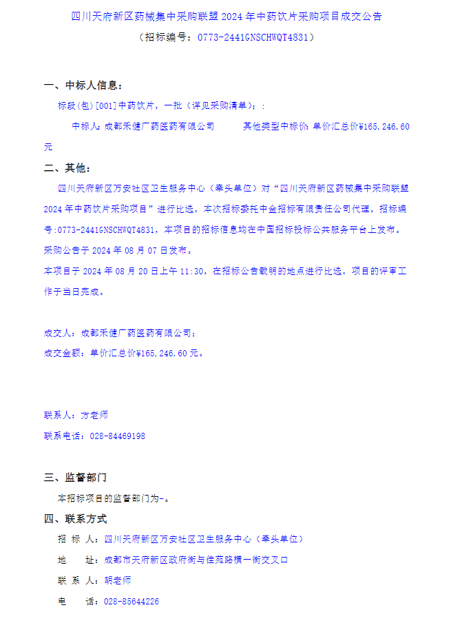 【成都市天府新区万安社区卫生服务中心】四川天府新区药械集中采购联盟2024年中药饮片采购项目成交公告