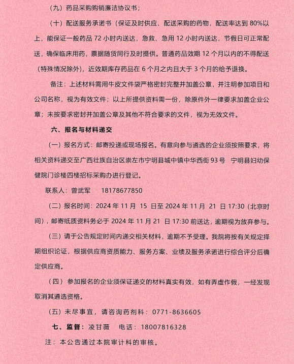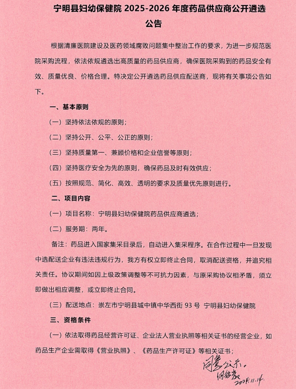 【崇左市宁明县妇幼保健院】广西壮族自治区崇左市宁明县妇幼保健院2025-2026年度药品供应商公开遴选公告