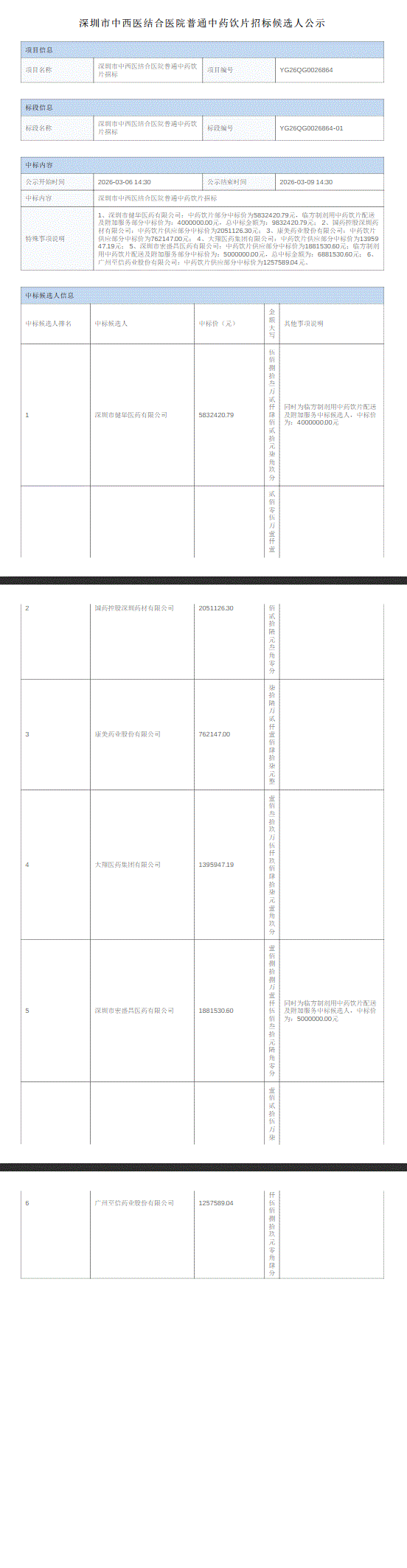 【深圳市中西医结合医院】广东省深圳市中西医结合医院普通中药饮片招标候选人公示