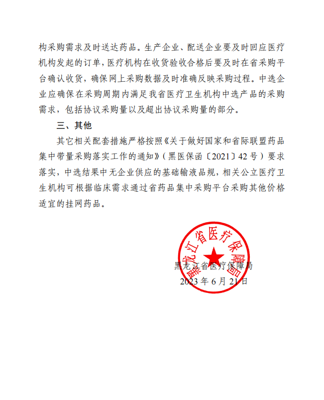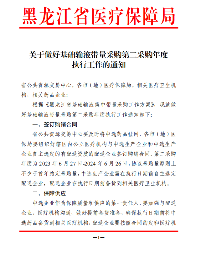 根据《黑龙江省基础输液集中带量采购工作方案》,现就做好基础输液带量采购第二采购年度执行工作通知如下: