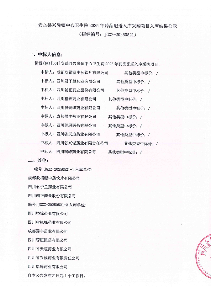 【资阳市安岳县兴隆镇中心卫生院】四川省资阳市安岳县兴隆镇中心卫生院2025年药品配送入库采购项目入库结果公示
