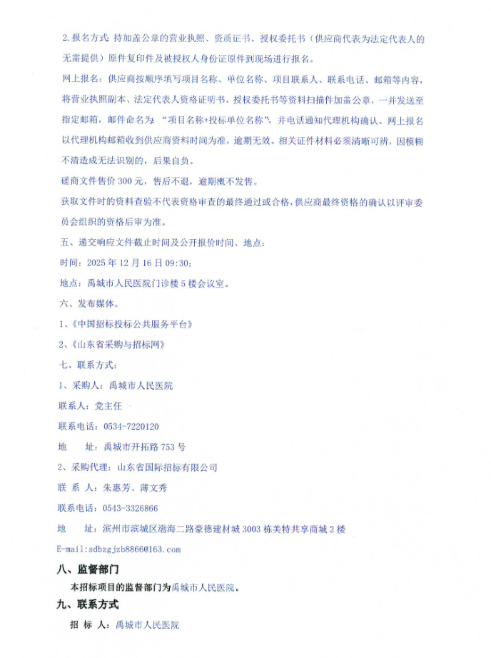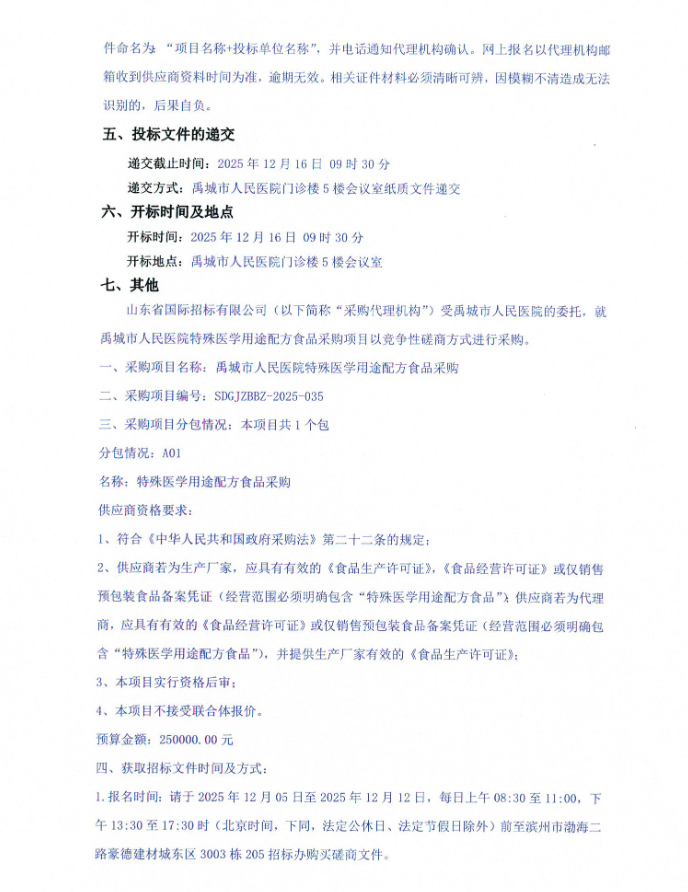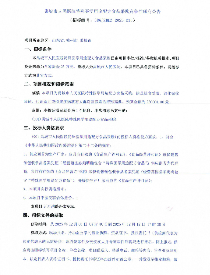 【德州市禹城市人民医院】山东省禹城市人民医院特殊医学用途配方食品采购竞争性磋商公告