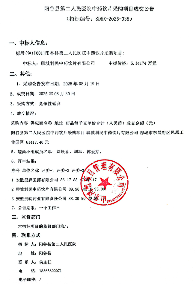 【聊城市阳谷县第二人民医院】山东省聊城市阳谷县第二人民医院中药饮片采购项目成交公告