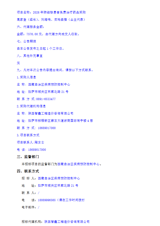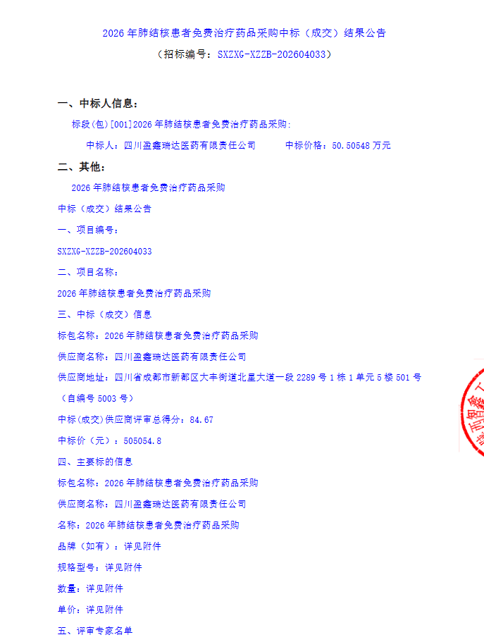 【西藏自治区疾病预防控制中心】西藏自治区疾病预防控制中心2026年肺结核患者免费治疗药品采购中标(成交)结果公告