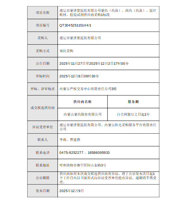 【通辽市蒙济堂医院有限公司】内蒙古自治区通辽市蒙济堂医院有限公司蒙药(药品)、西药(药品)、医疗耗材、检验试剂供应商采购候选人公示1