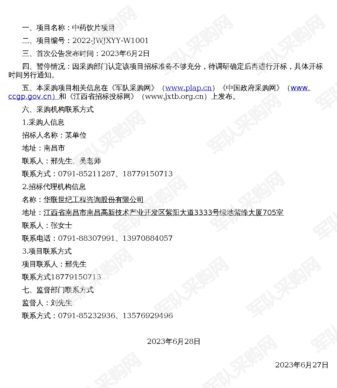 【军队采购】军队采购网某单位中药饮片项目(2022-JWJXYY-W1001)公开招标暂停公告