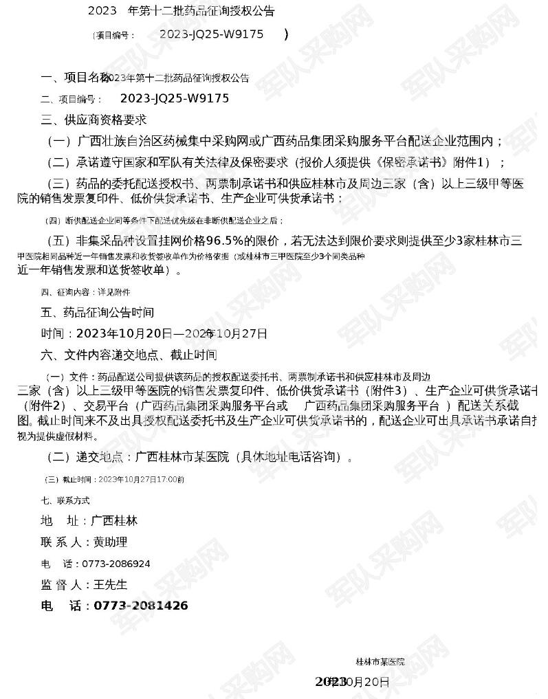 【军队采购】军队采购网2023年第十二批药品征询授权公告(2023-JQ25-W9175)