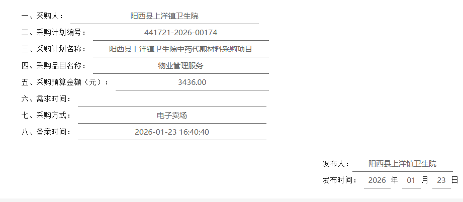 【阳江市阳西县上洋镇卫生院】广东省阳江市阳西县上洋镇卫生院中药代煎材料采购项目