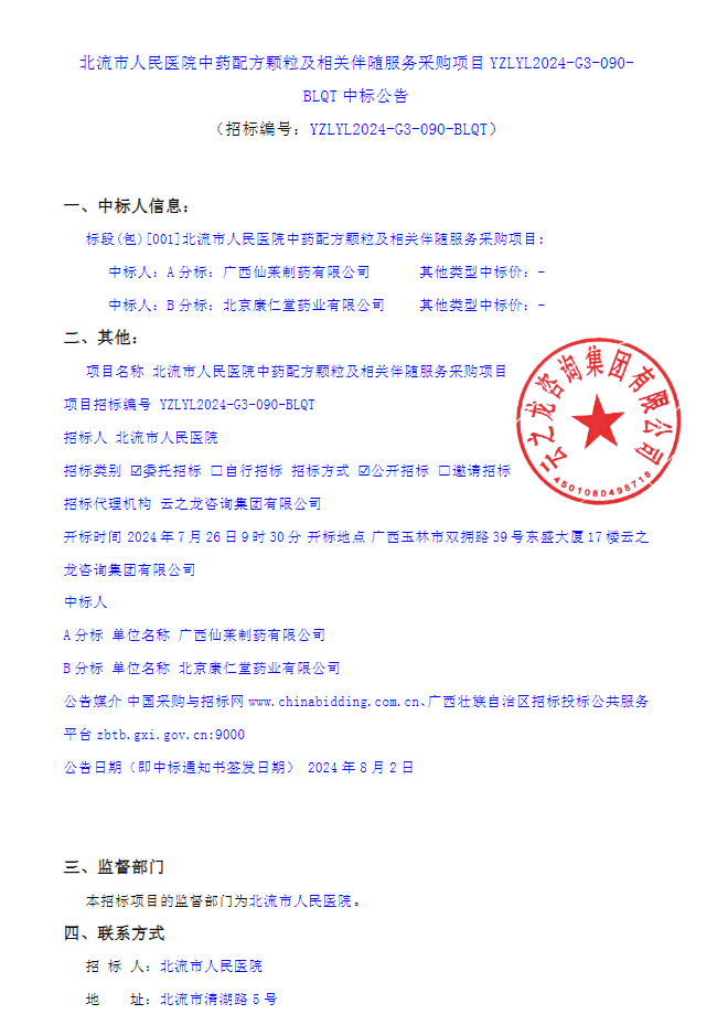 【玉林市北流市人民医院】广西壮族自治区玉林市北流市人民医院中药配方颗粒及相关伴随服务采购项目YZLYL2024-G3-090-BLQT中标公告