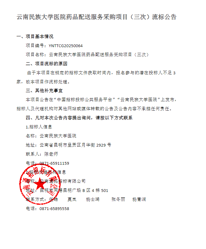 【云南民族大学医院】云南民族大学医院药品配送服务采购项目(三次)流标公告