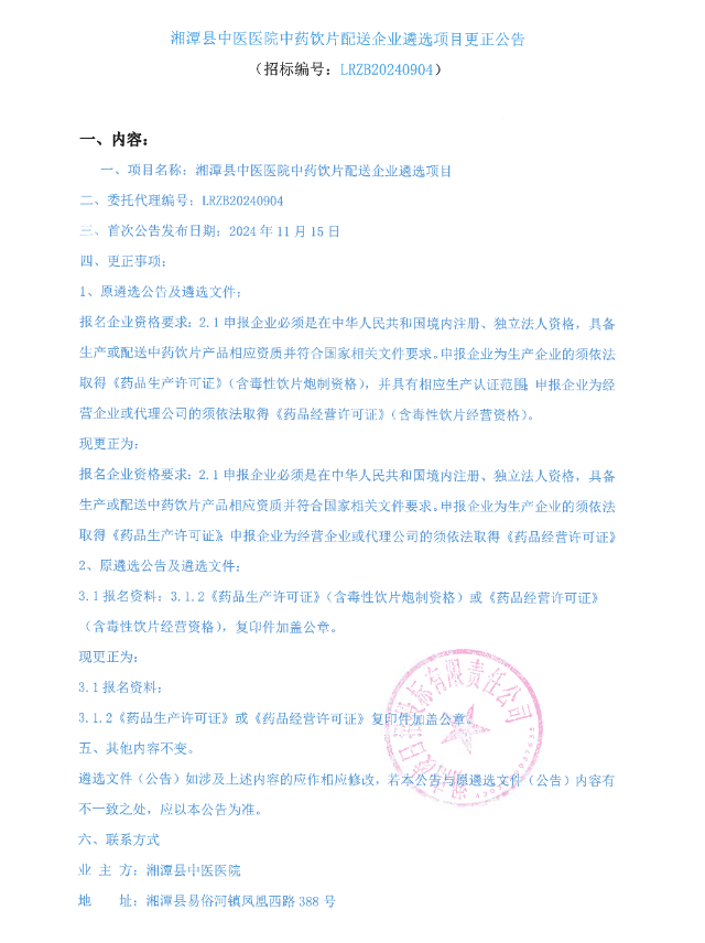 【湘潭市湘潭县中医医院】湖南省湘潭市湘潭县中医医院中药饮片配送企业遴选项目更正公告