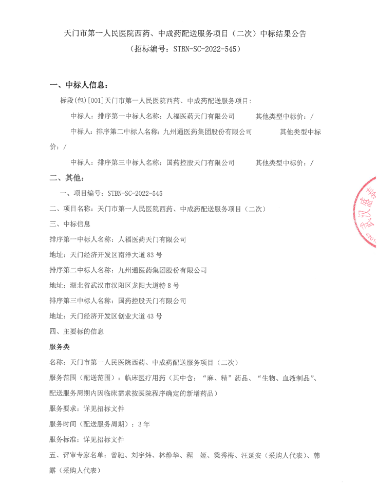 【天门市第一人民医院】湖北省天门市第一人民医院西药、中成药配送服务项目(二次)中标结果公告