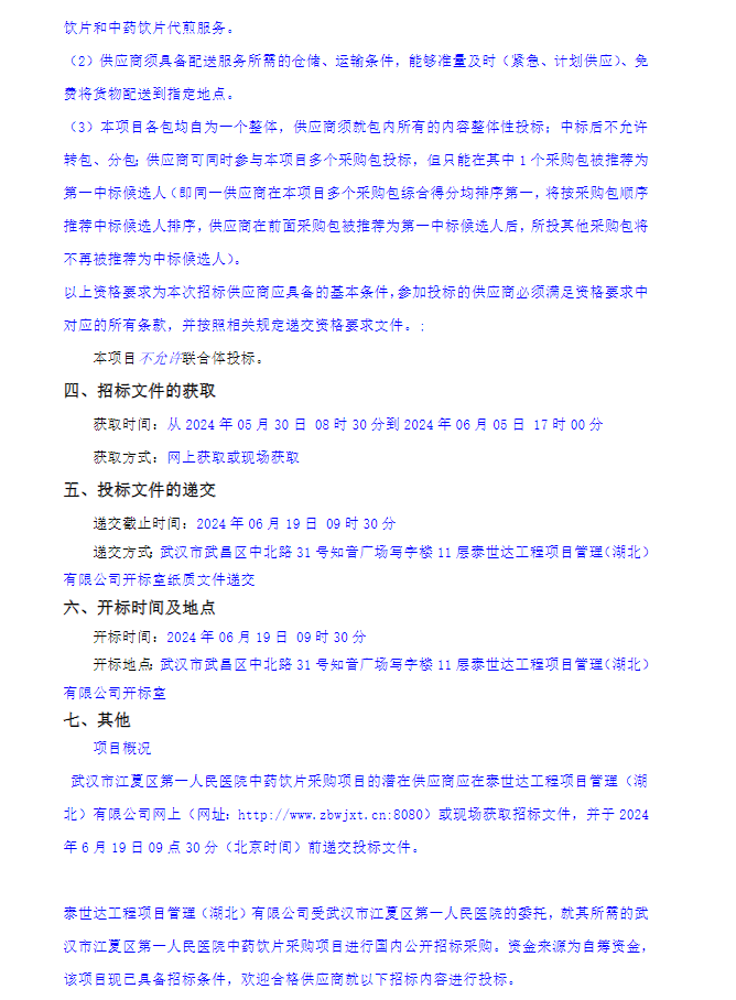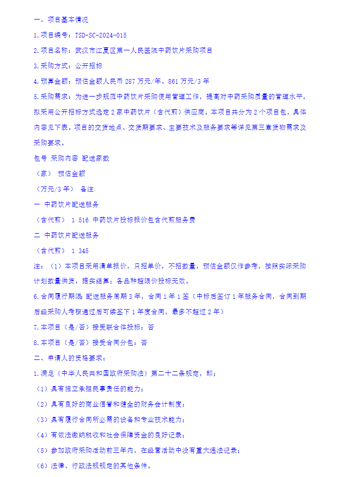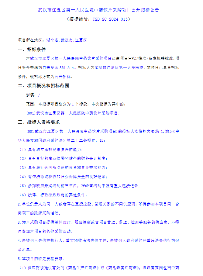【武汉市江夏区第一人民医院】湖北省武汉市江夏区第一人民医院中药饮片采购项目公开招标公告