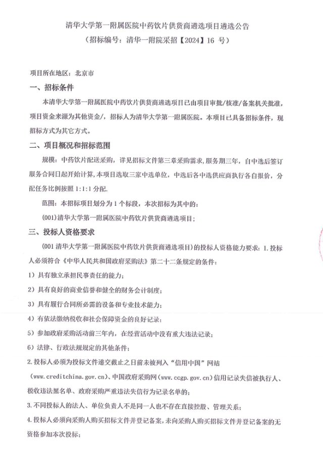 【北京市清华大学第一附属医院】北京市清华大学第一附属医院中药饮片供货商遴选项目遴选公告