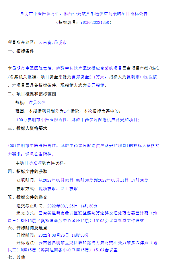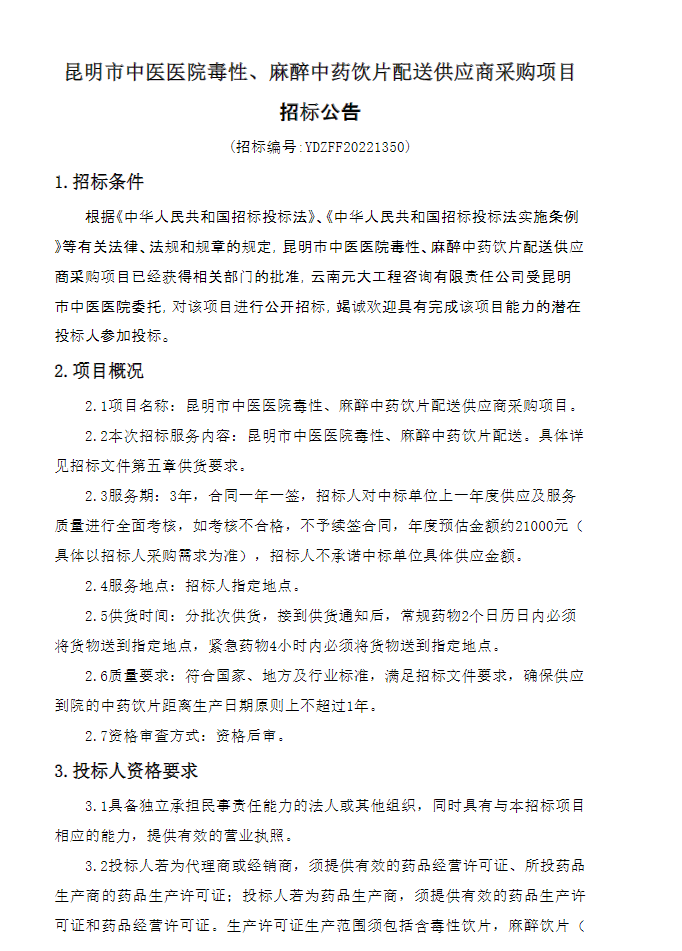 【昆明市中医医】云南昆明市中医医院毒性、麻醉中药饮片配送供应商采购招标公告