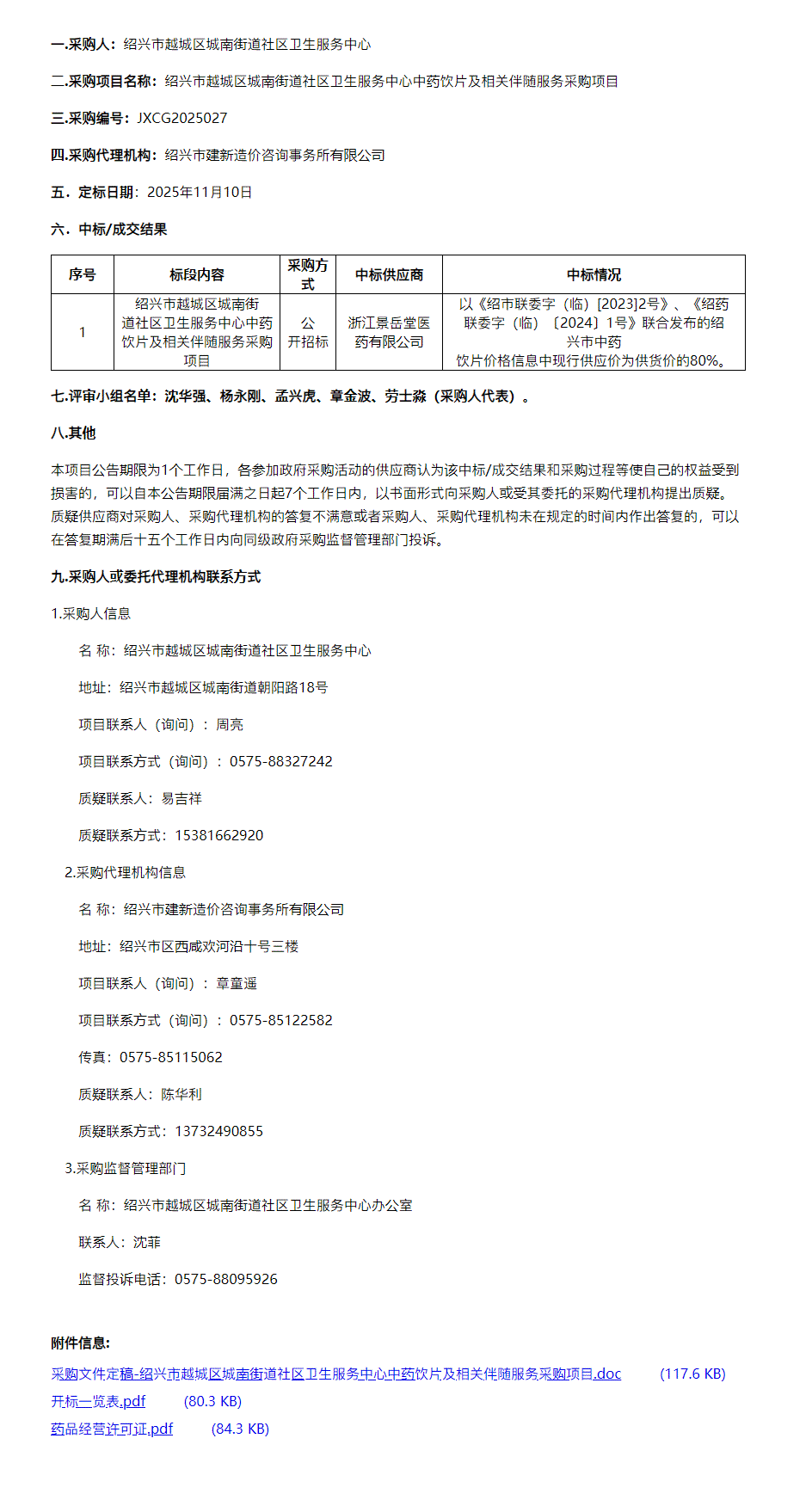 【绍兴市越城区城南街道社区卫生服务中心】浙江省绍兴市建新造价咨询事务所有限公司关于绍兴市越城区城南街道社区卫生服务中心中药饮片及相关伴随服务采购项目的中标结果公告