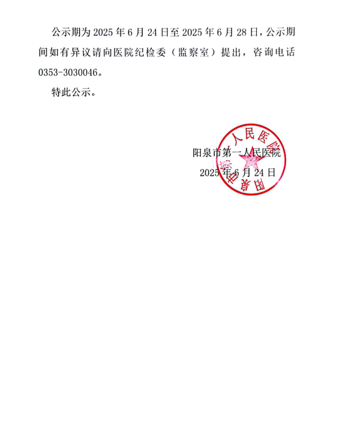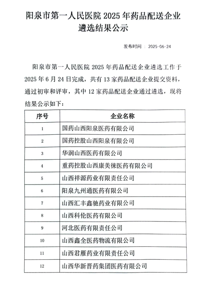 【阳泉市第一人民医院】山西省阳泉市第一人民医院2025年药品配送企业遴选结果公示