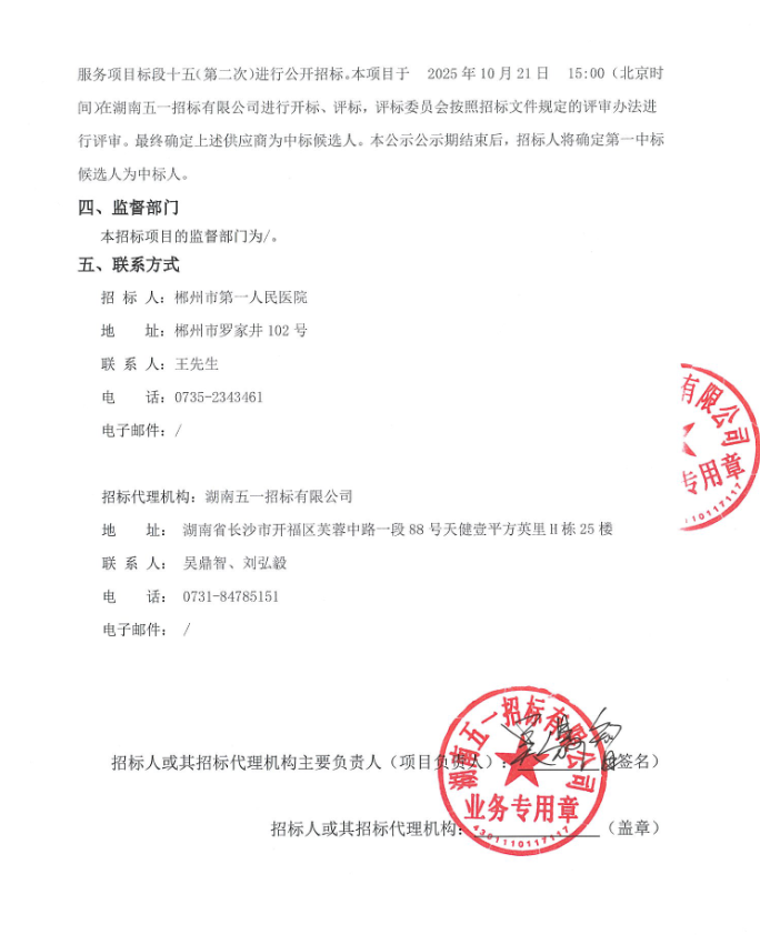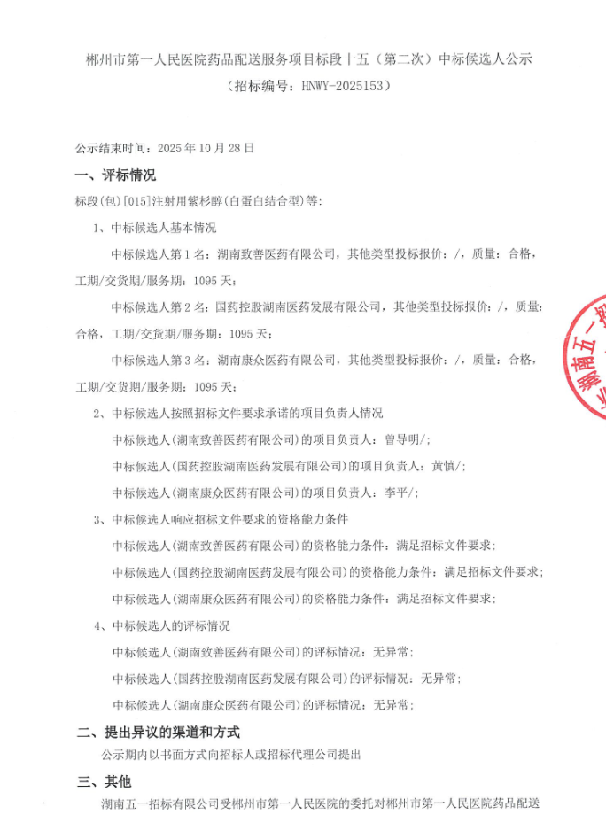 【郴州市第一人民医院】湖南省郴州市第一人民医院药品配送服务项目标段十五(第二次)中标候选人公示