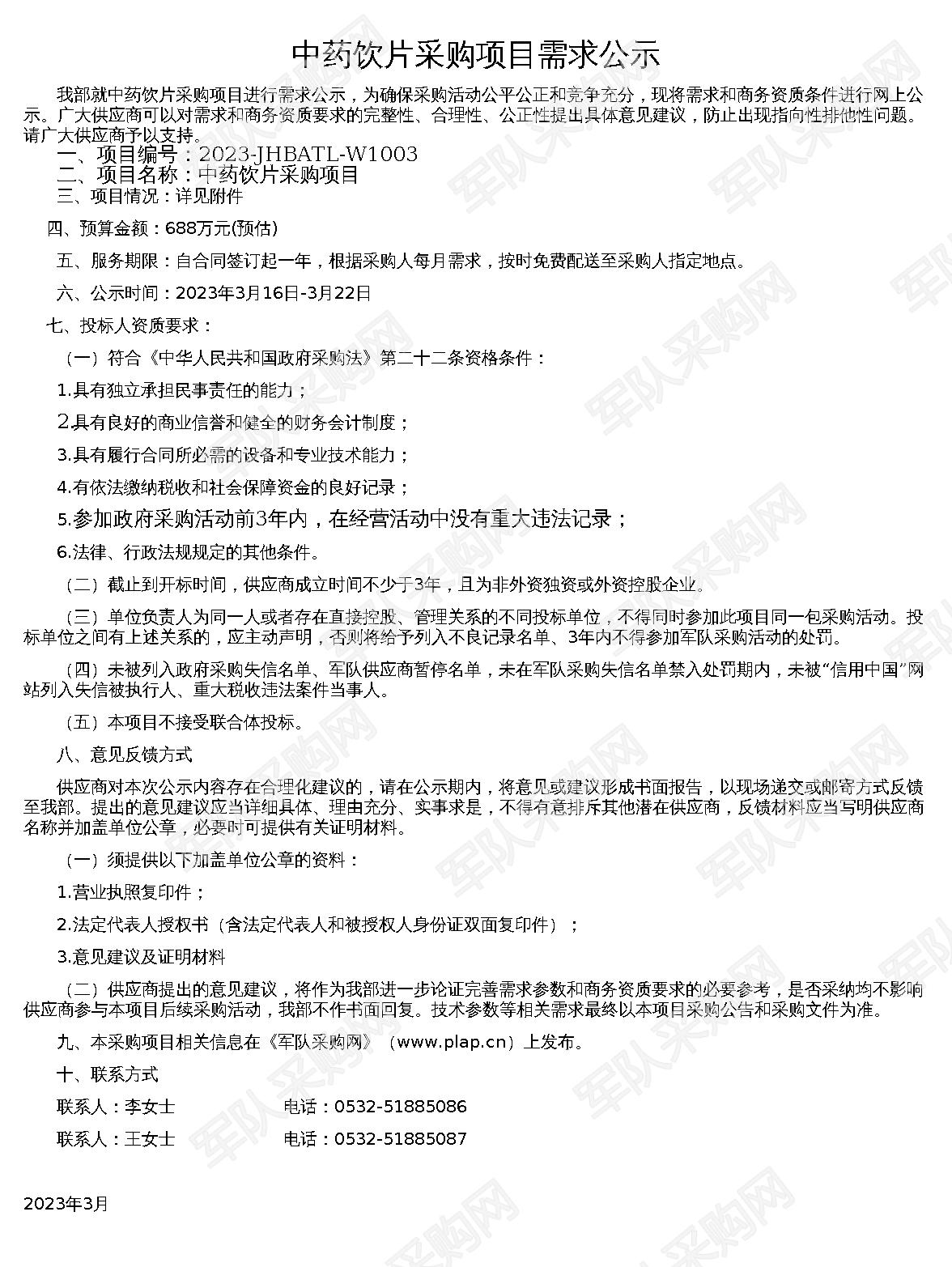【军队采购】军队采购网中药饮片采购项目需求公示(2023-JHBATL-W1003)