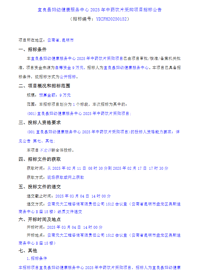 【昆明市宜良县妇幼健康服务中心】云南省昆明市宜良县妇幼健康服务中心2025年中药饮片采购项目招标公告