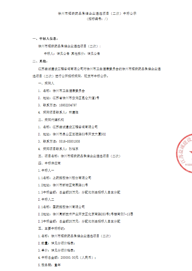 【徐州】徐州市短缺药品承储企业遴选项目(二次)中标公示