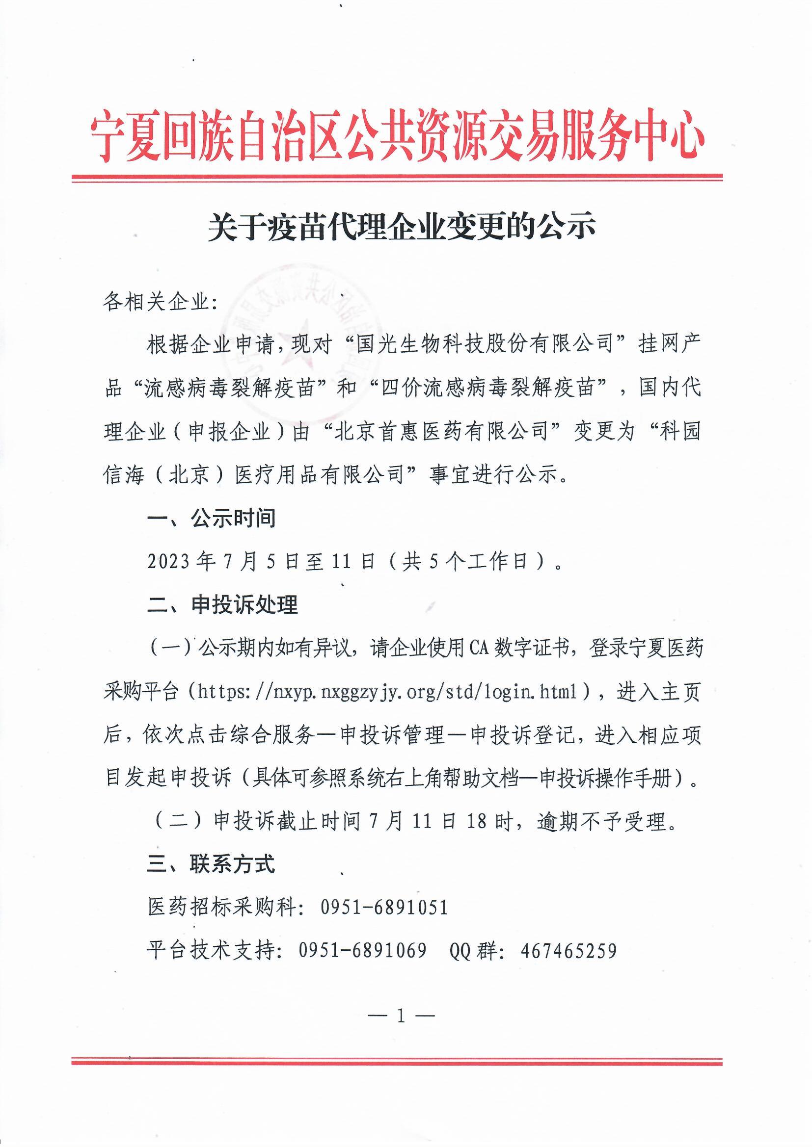 根据企业申请,现对“国光生物科技股份有限公司”挂网产品“流感病毒裂解疫苗”和“四价流感病毒裂解疫苗”,国内代理企业(申报企业)由“北京首惠医药有限公司”变更为“科园信海(北京)医疗用品有限公司”事宜进行公示。