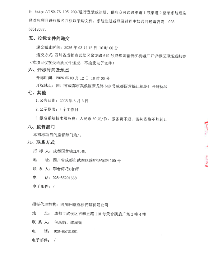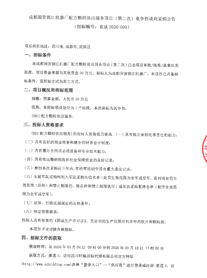 【成都国营锦江机器厂】四川省成都国营锦江机器厂配方颗粒供应服务项目(第二次)竞争性谈判采购公告