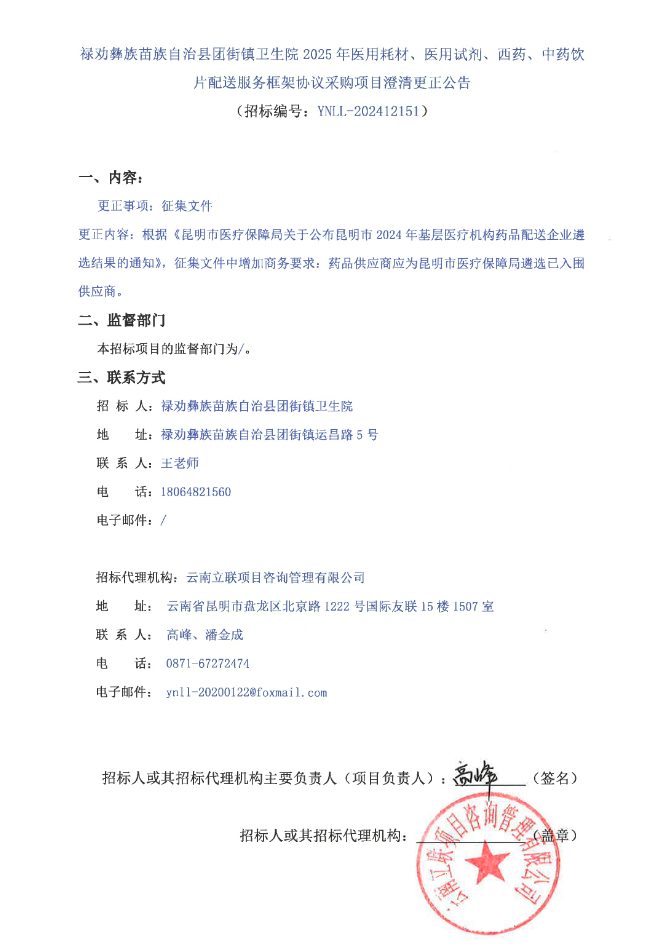 【昆明市禄劝彝族苗族自治县团街镇卫生院】云南省昆明市禄劝彝族苗族自治县团街镇卫生院2025年医用耗材、医用试剂、西药、中药饮片配送服务框架协议采购项目澄清更正公告