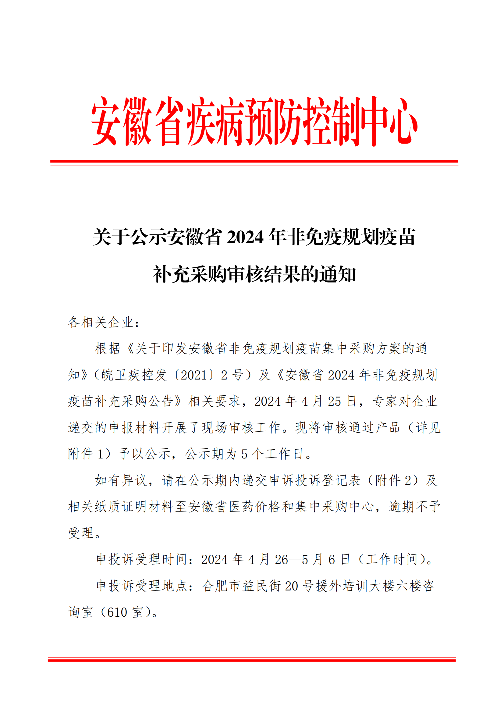 【安徽】关于公示安徽省2024年非免疫规划疫苗补充采购审核结果的通知