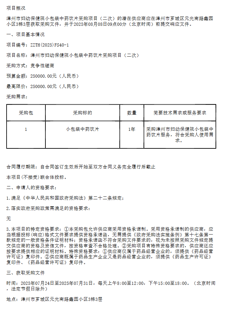 【漳州市妇幼保健院】福建省漳州市妇幼保健院小包装中药饮片采购项目(二次)竞争性磋商公告