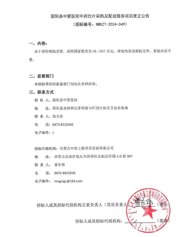 【包头市固阳县中蒙医院】内蒙古自治区包头市固阳县中蒙医院中药饮片采购及配送服务项目更正公告