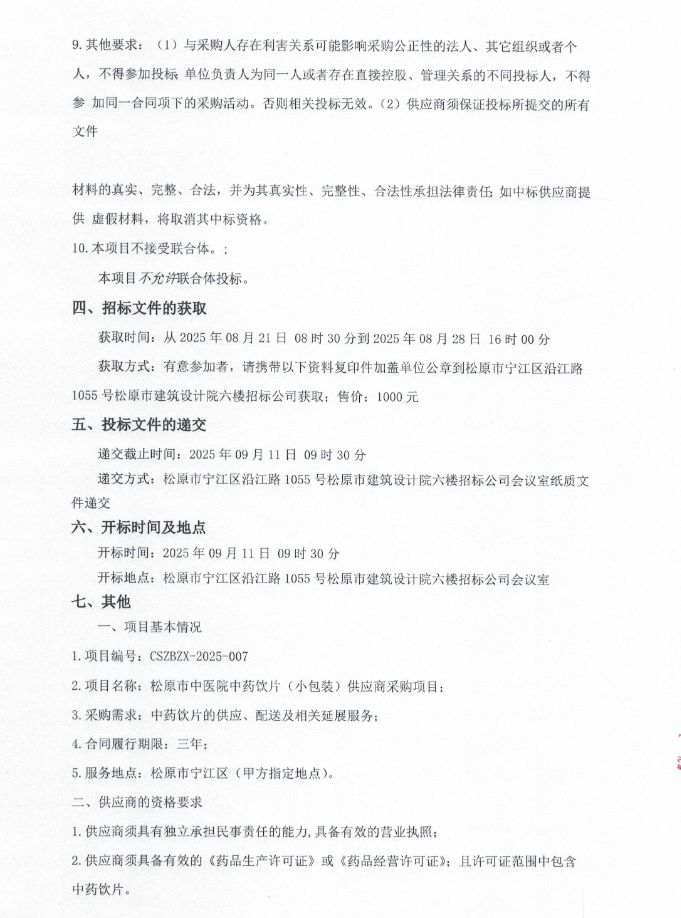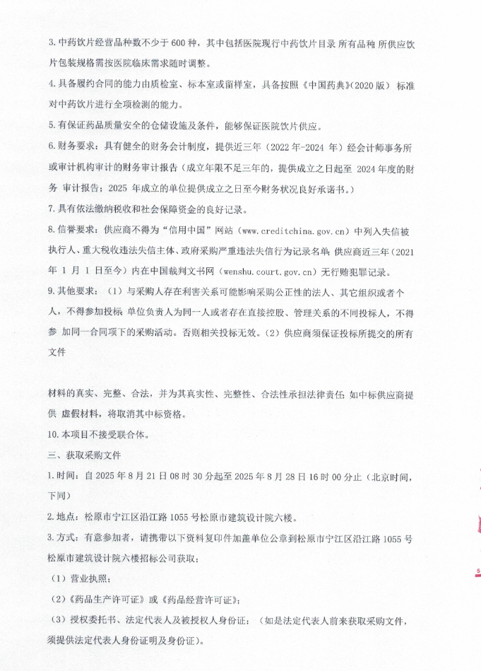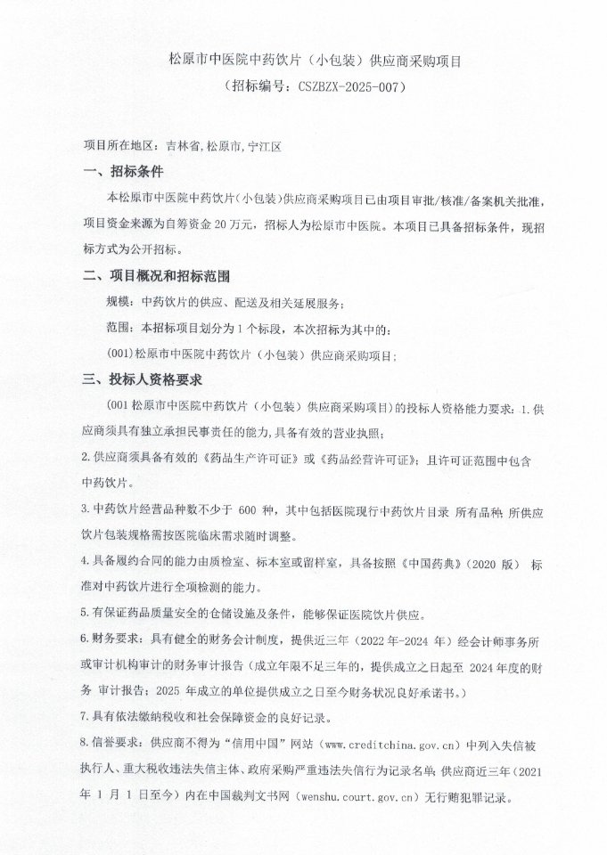 【松原市中医院】吉林省松原市中医院中药饮片(小包装)供应商采购项目