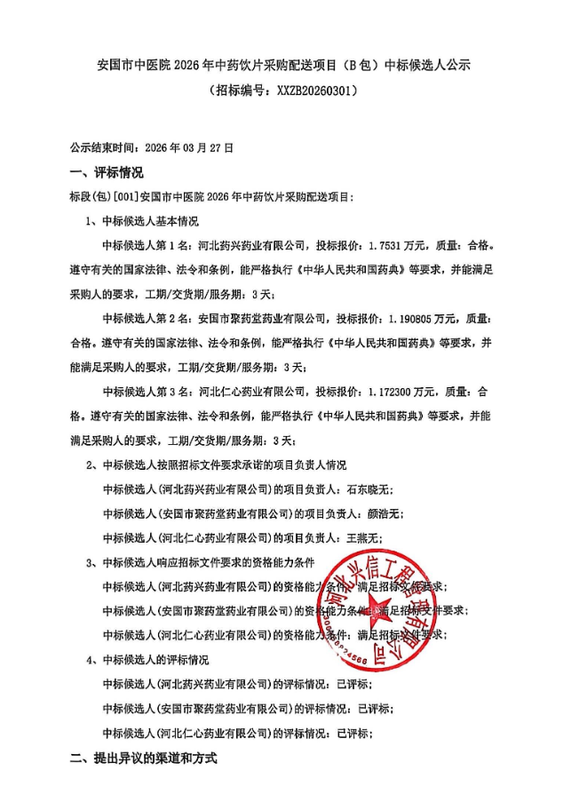 【保定市安国市中医院】河北省保定市安国市中医院2026年中药饮片采购配送项目(B包)中标候选人公示